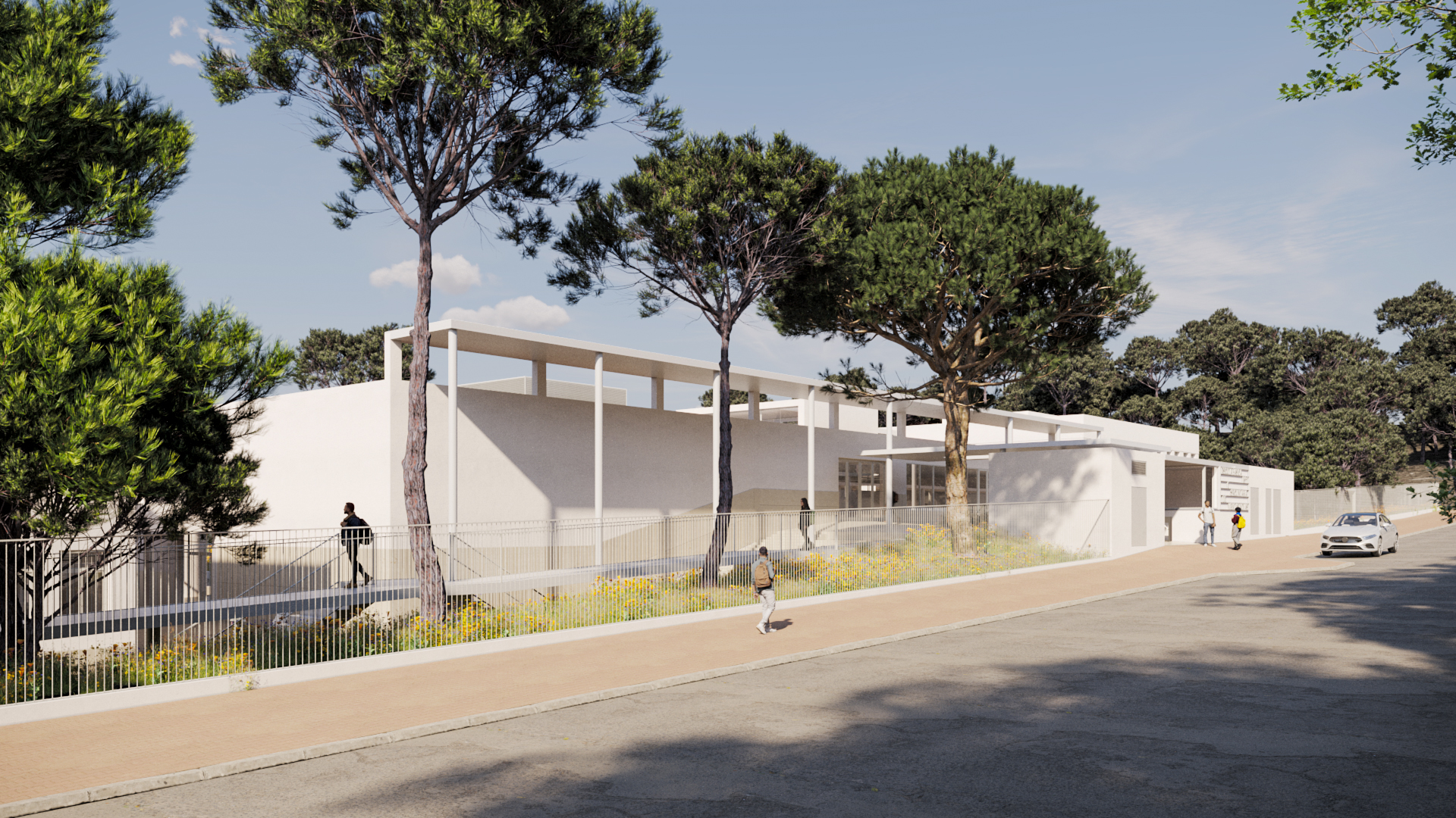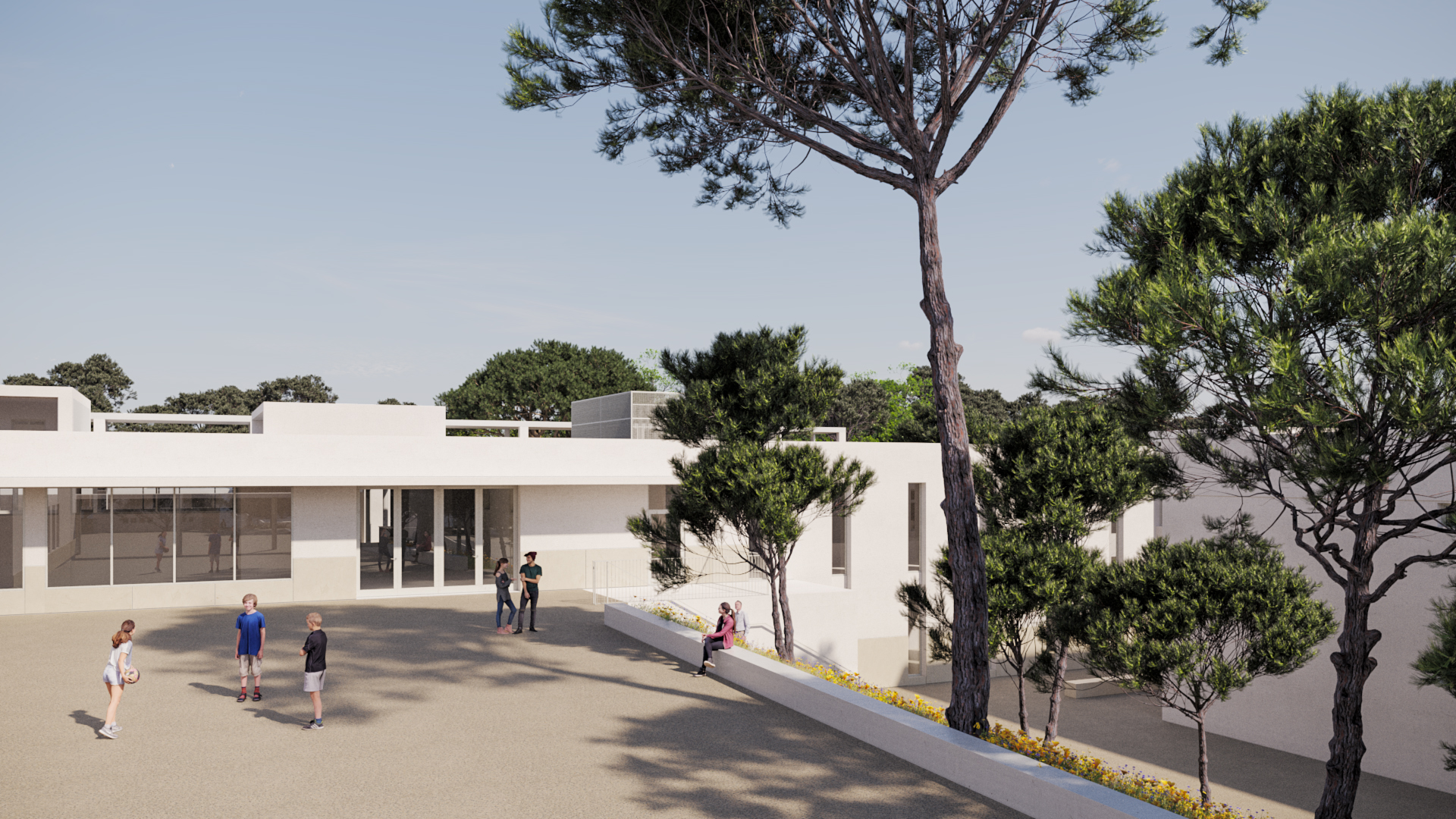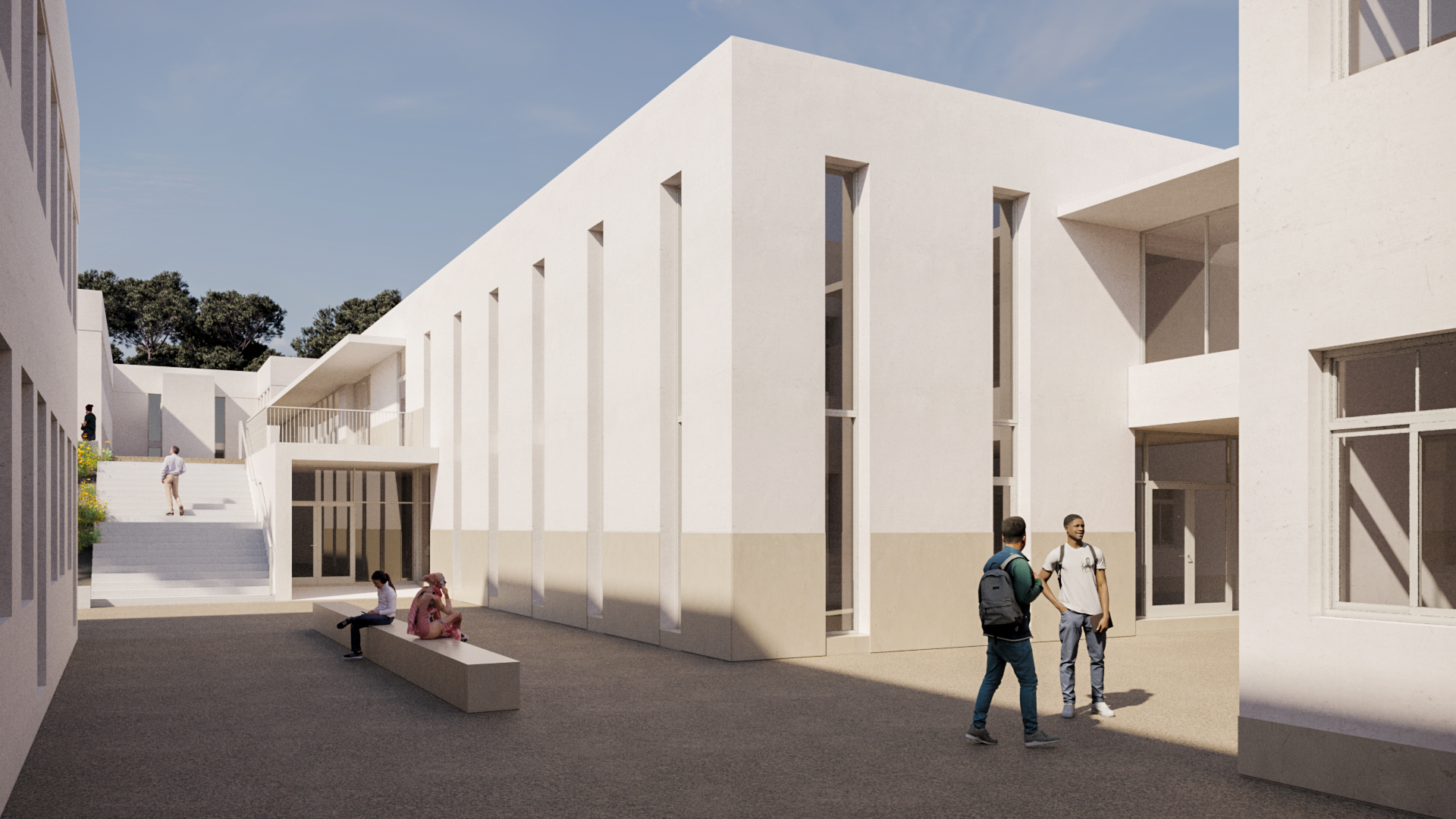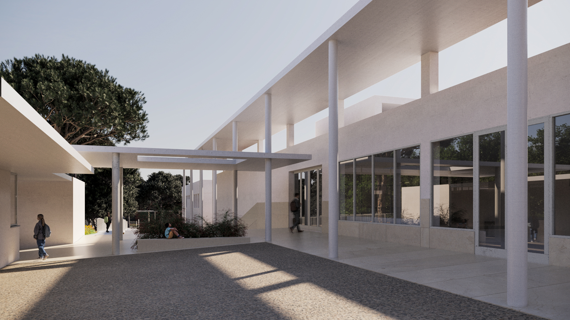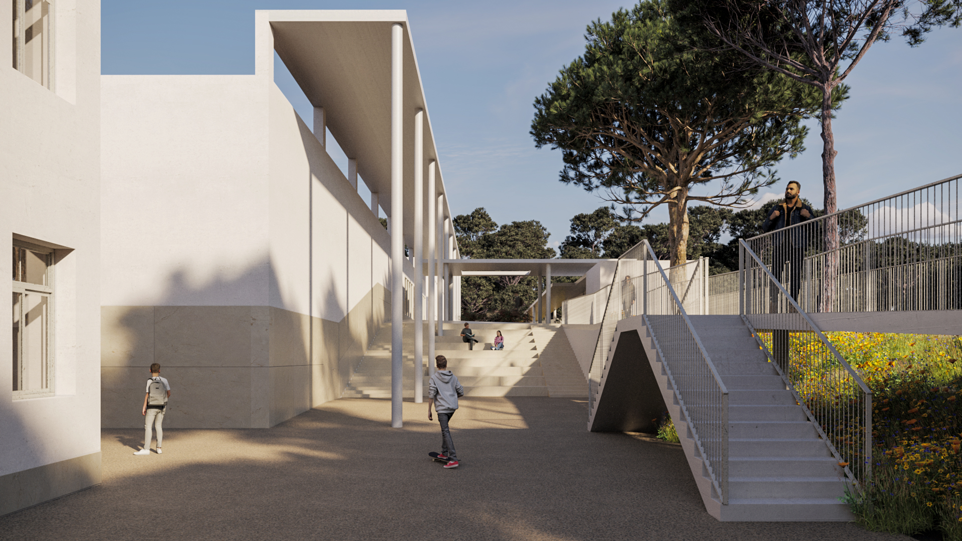 O projeto visa melhorar a funcionalidade, acessibilidade e eficiência energética das escolas, unindo os edifícios num bloco central sustentável. A nova praceta de receção, parcialmente coberta, liga os espaços e cria um pórtico que harmoniza os diferentes níveis. O bloco central inclui receção, biblioteca e um auditório com 198 lugares, além de corredores internos que interligam as escolas. O espaço exterior é requalificado com áreas de estar e um corredor verde. A proposta respeita a estrutura existente, melhorando a circulação e criando um ambiente moderno e funcional.