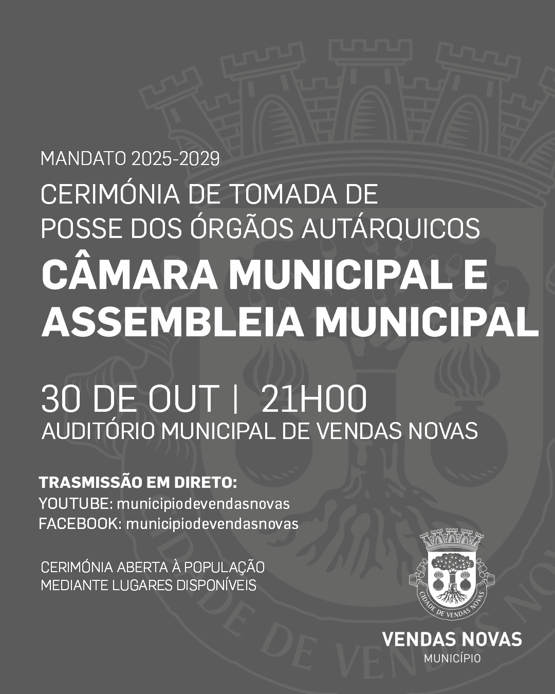 No seguimento do ato eleitoral do passado dia 12 de outubro, informamos que a cerimónia de Tomada de Posse dos titulares dos órgãos autárquicos da Câmara e Assembleia Municipal para o mandato 2025-2029, irá acontecer na próxima quinta-feira, 30 de outubro, pelas 21h00, no Auditório Municipal de Vendas Novas.